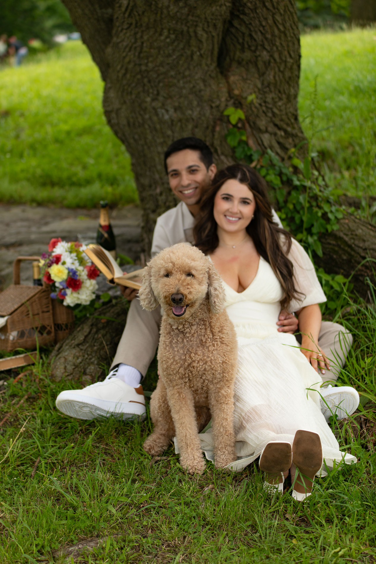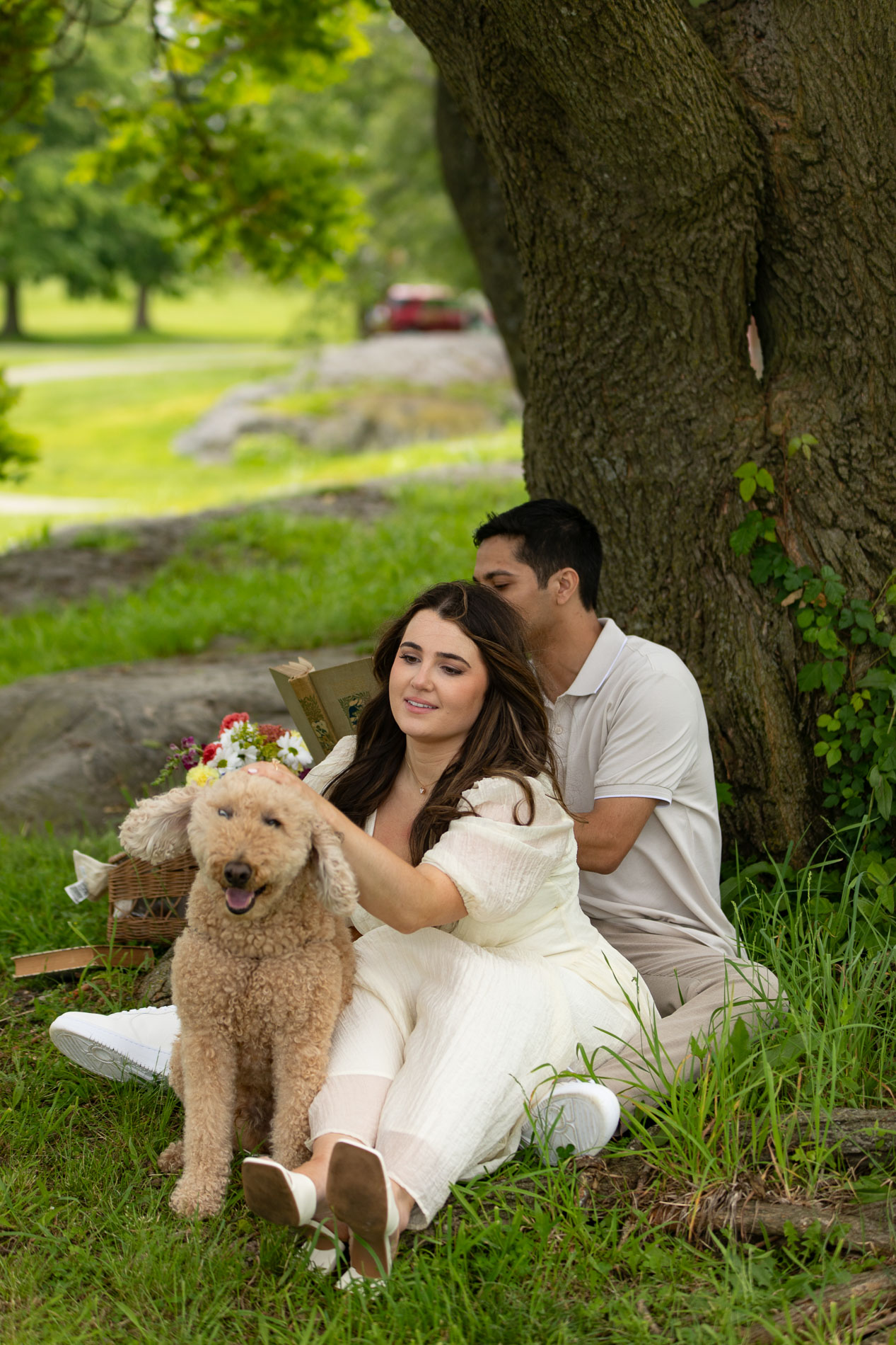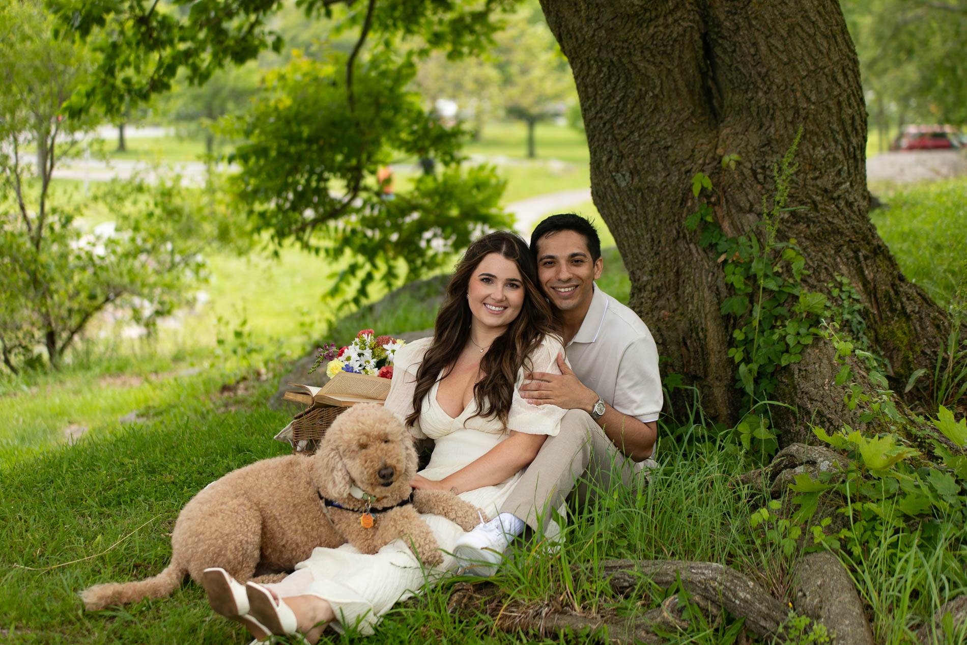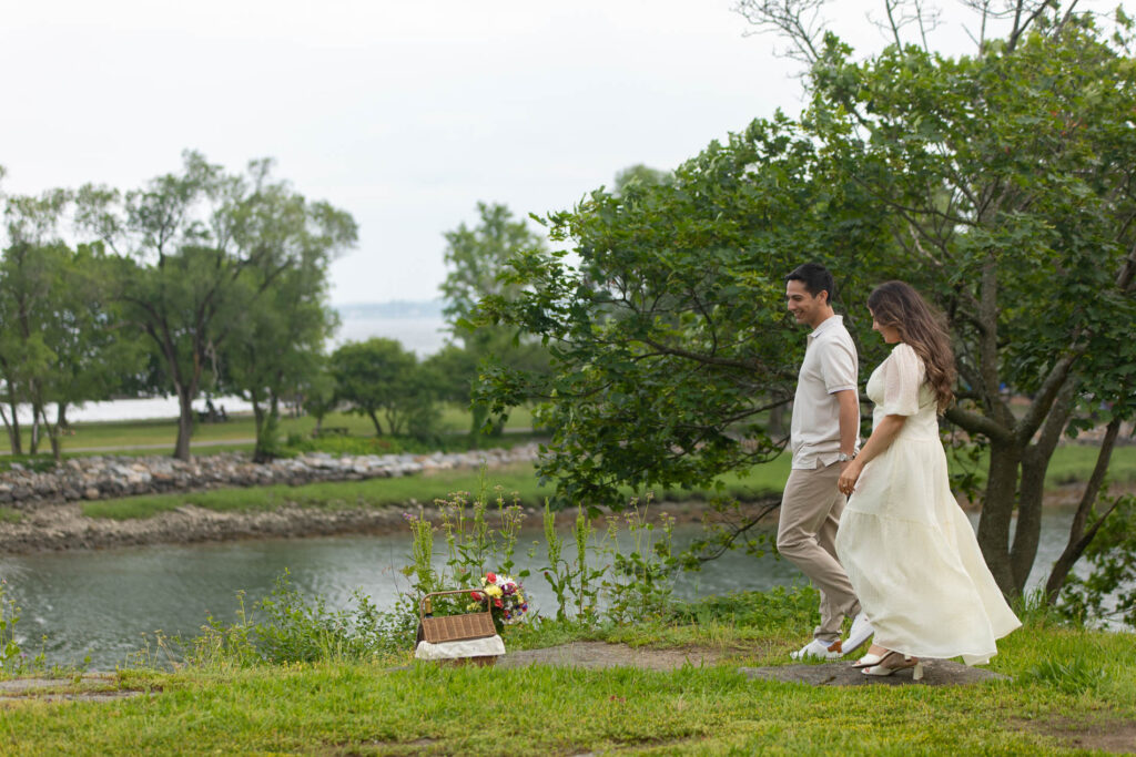 For their engagement session, we chose Glen Island, a picturesque park in New Rochelle, New York, with waterfront views, open fields, and a relaxed atmosphere that was perfect for their picnic-inspired theme. We wanted it to feel intentional and elevated—more than just a walk through the park.